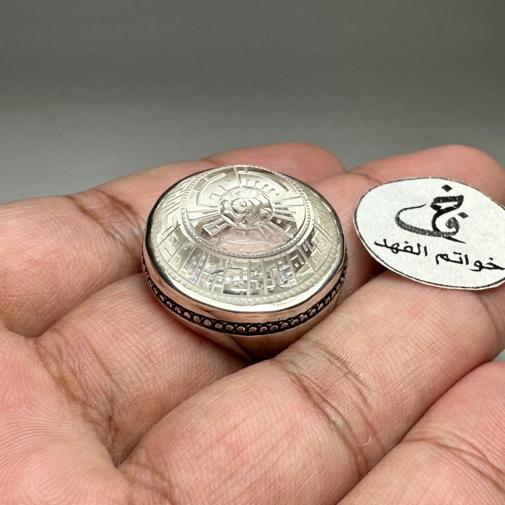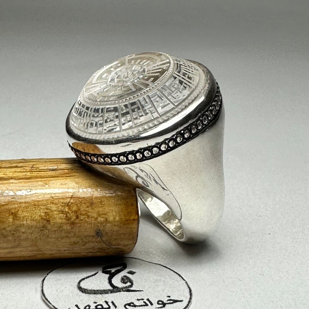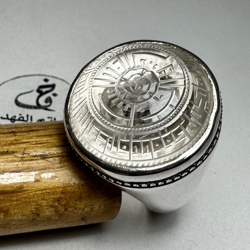 خاتم فضه اسطوري حجر در نجفي طبيعي منقوش سورة الاخلاص بارجست بالخط الكوفي الهندسي نقش المبدع الشيخ عقيل الكربلائي ، مقاس الحجر 21 ملم